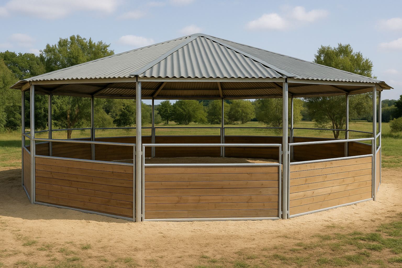 Il tondino in ferro zincato e legno rappresenta uno spazio ideale per la lavorazione in libertà, la doma dolce e l’addestramento quotidiano.